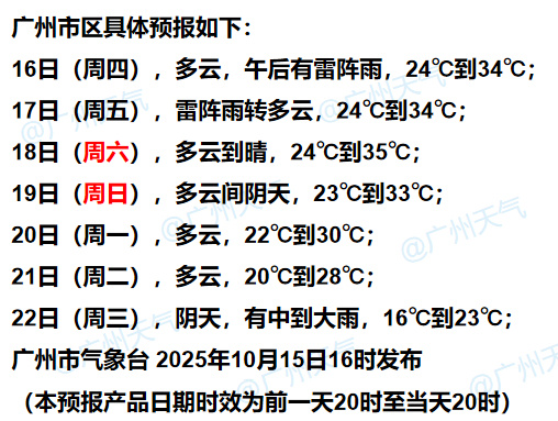 @广州天气 表示,今天午后到夜间有雷阵雨,晾晒需要留意天色变化。未来三天最高气温维持在34℃~35℃,19日起受到冷空气影响。