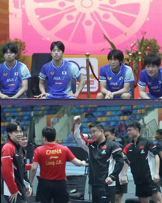 比赛结束后,梁靖崑、王楚钦拥抱、摸头庆祝,与日本队集体凝固形成鲜明对比。