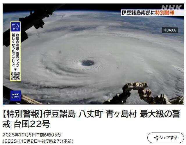 据日本广播协会(NHK)报道,2025年第22号台风“夏浪”将于当地时间9日凌晨至早晨接近日本伊豆群岛,日本气象厅已发布暴风与巨浪的特别警报,指出当地可能出现数十年一遇的大规模灾害。