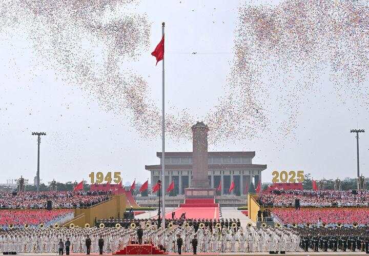 2025年9月3日,纪念中国人民抗日战争暨世界反法西斯战争胜利80周年大会在北京隆重举行。这是纪念大会现场放飞气球。新华社记者 李贺 摄