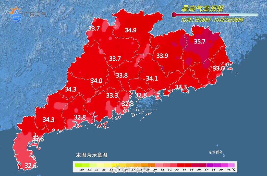 ◆预计,国庆和中秋假期前期(10月1-4日)广东以晴到多云天气为主;中期(5-6日)热带气旋可能给广东南部市县和海面带来风雨影响;后期(7-8日),有弱冷空气扩散至南岭附近,广东仍以多云天气为主,部分市县有(雷)阵雨。