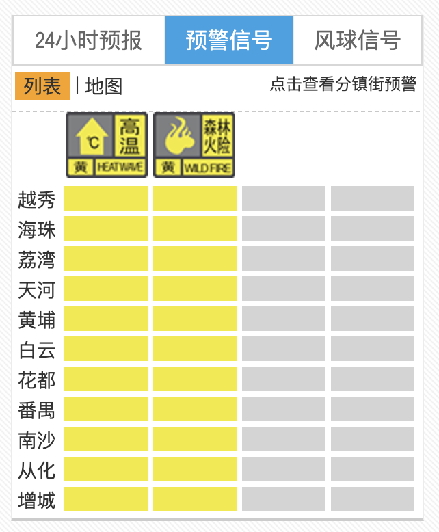 在森林火险预警信号发布前,广州市气象台亦表示,预计未来3天广州市越秀区、天河区最高气温将接近或达到35℃,从10月1日10时起,广州市越秀区、天河区高温黄色预警信号生效,请注意防暑降温。