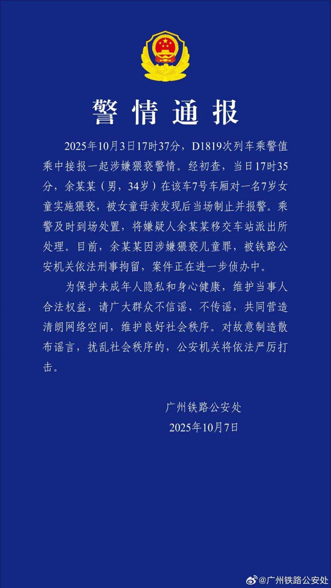 10月7日,广州铁路公安处发布警情通报:2025年10月3日17时35分,在D1819次列车上,一34岁男子对一名7岁女童实施猥亵,被女童母亲发现后当场制止,该男子涉嫌猥亵儿童罪已被刑拘。