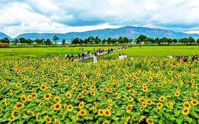 10月4日,游客在云南昆明滇池边的福保村欣赏向日葵。新华社发