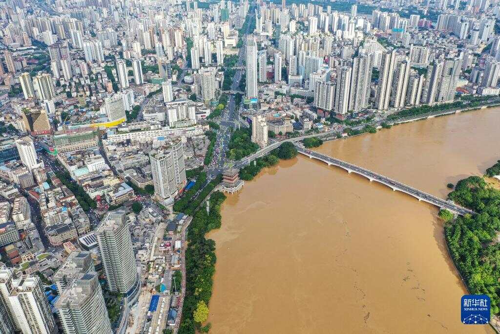 10月3日,郁江广西南宁城区河段(邕江)水位持续上涨(无人机照片)。