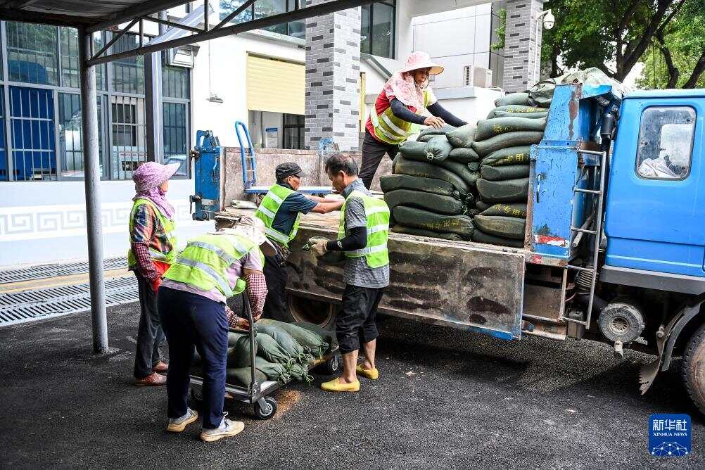10月3日,南宁市水利部门的工作人员在搬运应急防汛沙包。