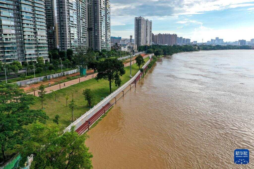 10月3日,郁江广西南宁城区河段(邕江)水位持续上涨,部分江边步道被淹(无人机照片)。