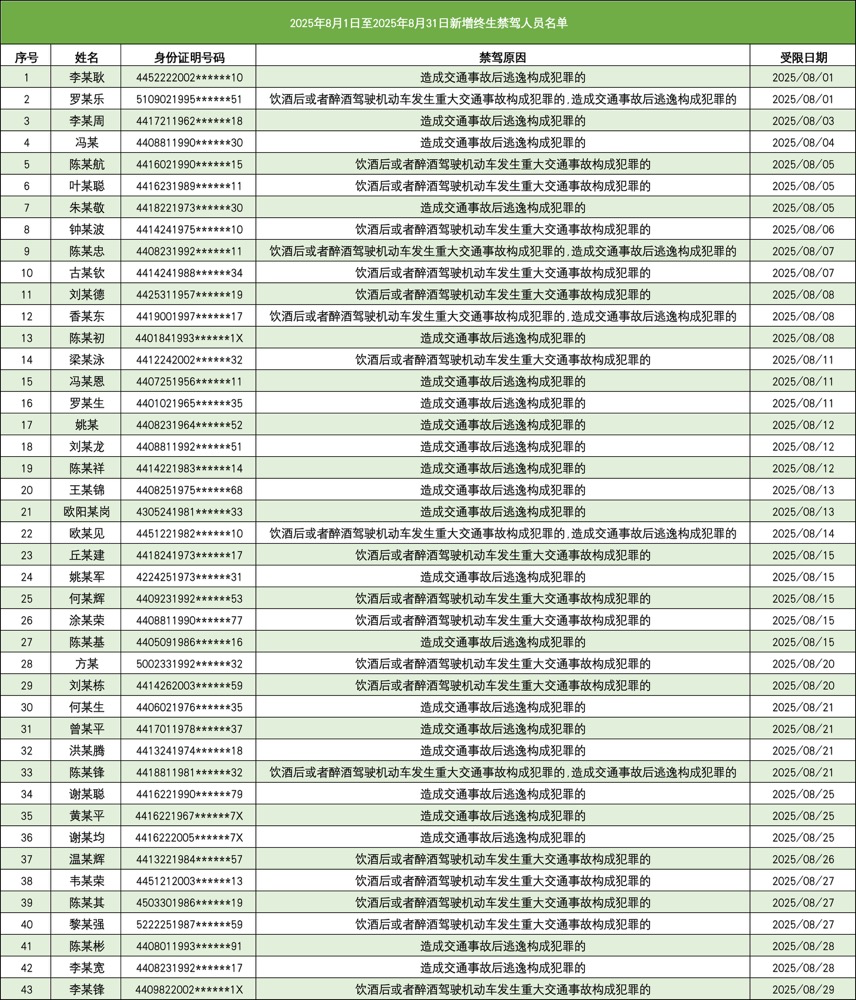 此次公布的8月新增的终生禁驾人员共有43人。其中,22人因造成交通事故后逃逸构成犯罪被终生禁驾,16人属于饮酒或醉酒驾驶机动车发生重大交通事故构成犯罪被终生禁驾,5人属于饮酒或醉酒驾驶机动车造成重大交通事故后逃逸构成犯罪被终生禁驾。年龄最小的谢某均仅20岁,其终生禁驾原因为其造成交通事故后逃逸构成犯罪。