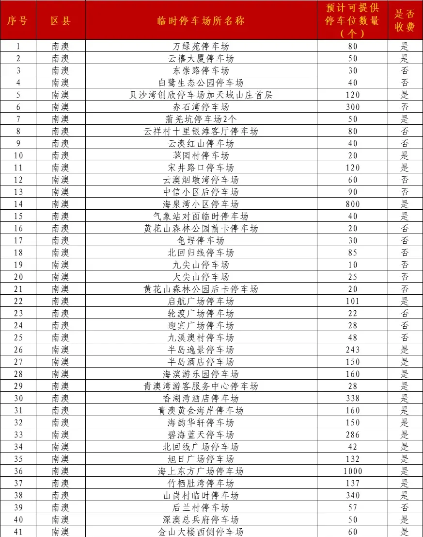 南澳共开放42个临时停车场(约5742个停车位):