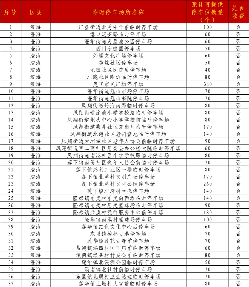 澄海共开放37个临时停车场(约3640个停车位):
