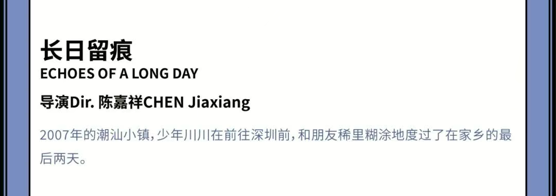 近日,2025年第九届平遥国际电影展(9th Pingyao Crouching Tiger Hidden Dragon International Film Festival)正式公布影展日程及排片表。由“向山海走去”青年导演创作扶持计划(简称山海计划)扶持拍摄,陈嘉祥执导的短片《长日留痕》(ECHOES OF A LONG DAY)此前成功入选“藏龙·短片”(Hidden Dragons·Shorts)名单,并将于平遥电影宫4号厅迎来2场放映,其中9月25日晚19时场为世界首映,导演陈嘉祥及主创团队届时也会出席映后交流。