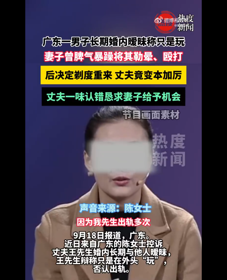 后陈先生承认有暧昧对象,解释是男女朋友关系仍坚是正常“玩”。陈女士因丈夫狡辩曾做出将其头打出血、勒晕等过激行为,王先生反指陈女士“凶狠泼辣”是自己在外“玩”的原因。