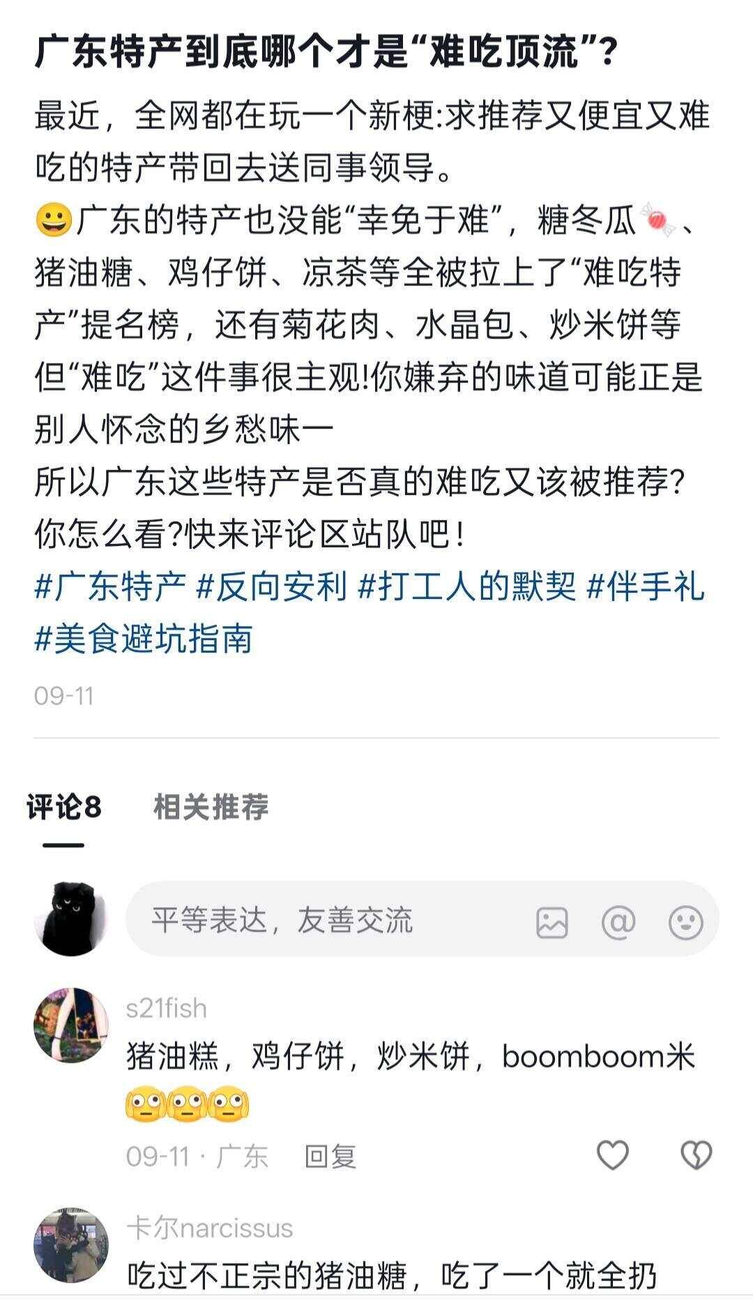 羊城晚报记者在社交平台搜索发现,关于广东“难吃特产”的吐槽内容随处可见,“口感不适”是网友反馈的核心问题。
