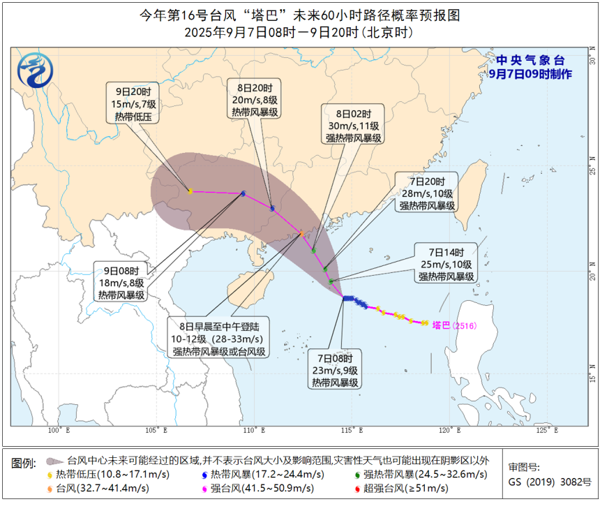 根据中央气象台观测,截至9月7日9时,今年第16号台风“塔巴”的中心,移至距离广东省阳江市东南方向约435公里的南海海面上,中心附近最大风力9级(23米/秒),达到热带风暴强度。预计“塔巴”将以每小时10-15公里的速度向西北方向移动,强度逐渐增强,并将于8日凌晨到中午在广东珠海至湛江一带沿海登陆(强热带风暴级或台风级,28-33米/秒,10-12级),登陆后强度逐渐减弱。