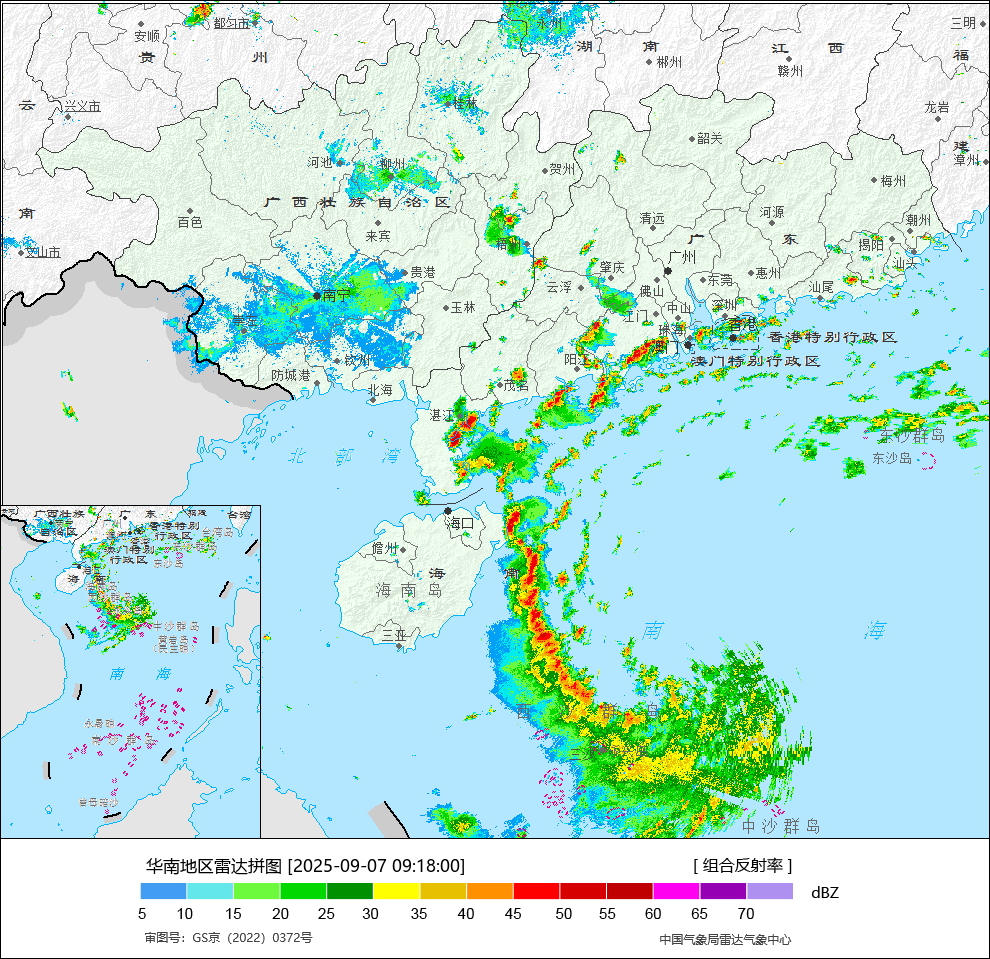 从9月7日9时18分的气象雷达图可见,“塔巴”的外围环流已经开始影响广东。