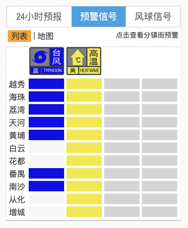 “塔巴”中心进一步趋近广东中西部沿海。在广州,广州市气象台表示,预计8日至9日广州有大到暴雨局部大暴雨,陆地阵风加大至6~8级。从7日9时08分起,越秀区、天河区台风白色预警信号升级为蓝色。截至7日9时27分,越秀、海珠、荔湾、天河、黄埔、番禺、南沙等区,已经发布台风蓝色预警信号。
