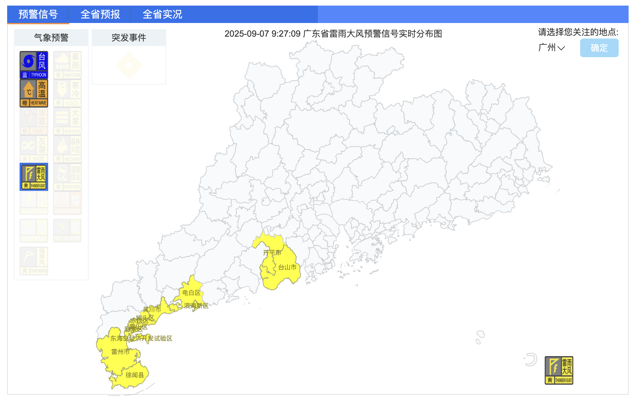 因应“塔巴”的环流“上岸”,广东多地在7日早晨起陆续发布雷雨大风预警信号。截至7日9时27分,湛江、茂名、江门等地,有市县区正在发布雷雨大风黄色预警信号。