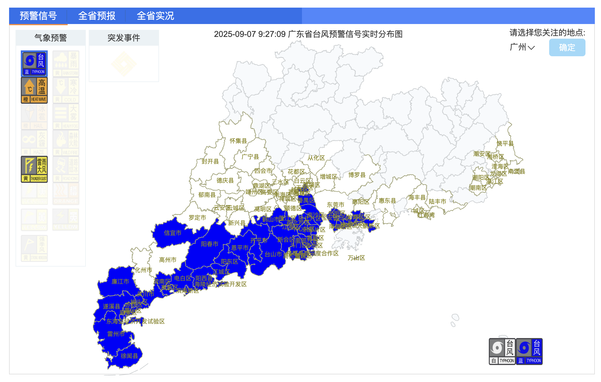 从广东全省范围看,湛江、茂名、阳江、江门、珠海、中山、广州、深圳等地,均已有市县区发布台风蓝色预警信号。