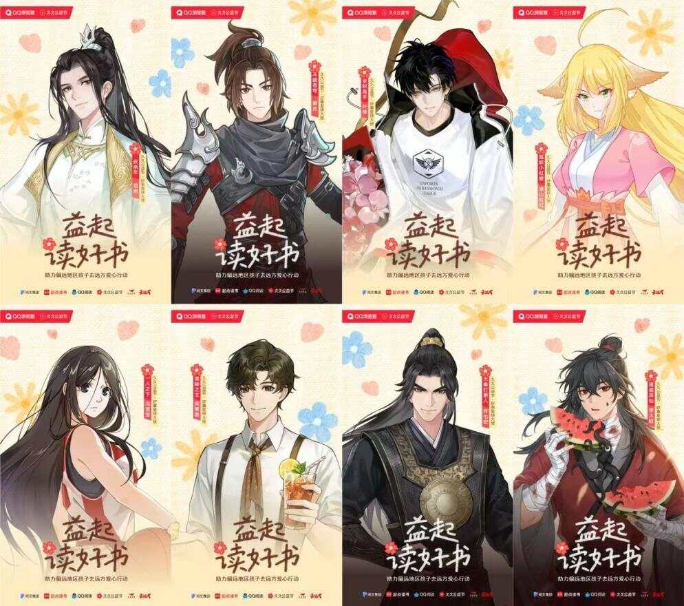 本次“益起读好书”,也是阅文旗下作家和IP角色参与人数最多、覆盖度最广的一次:包含狐尾的笔、会说话的肘子、孑与2、锦凰、历史系之狼、裴不了、一路烦花、远瞳等八位作家,以及《庆余年》范闲、《斗破苍穹》萧炎、《全职高手》叶修、《狐妖小红娘》涂山红红、《一人之下》冯宝宝、《诡秘之主》克莱恩、《大奉打更人》许七安、《道诡异仙》李火旺等八大IP角色,他们号召更多人参与进来,为有远方梦的孩子筹集爱心。