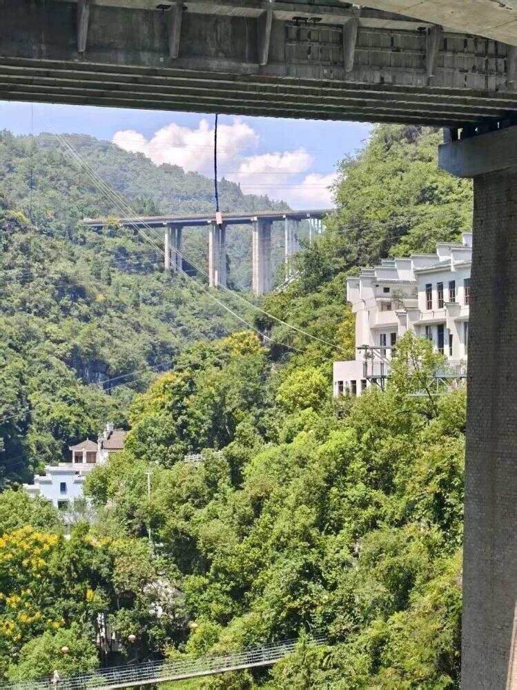 “断开”的蹦极绳,第二次反弹高度大概在旁边的桥墩顶部平行处