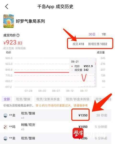 列”(下称星星人)IP备受市场追捧。由于现货一盒难求,盲盒在二手市场上价格迅速飙升。例如在千岛APP上,星星人22日最新整盒成交价达到1350元,溢价约3倍,单个平均价约150元,溢价约2倍,隐藏款价格高达478元,溢价更是超过6倍。有人直呼“这么贵到底是谁在买”“简直比黄金还离谱”。