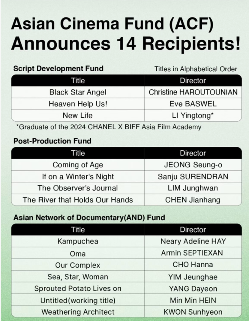 亚洲电影基金(ACF)是由釜山国际电影节(BIFF)设立的标志性电影制作支援基金项目,旨在支持独立电影制作并建立稳定的制作环境。通过全面的支持体系,亚洲电影基金(ACF)帮助新兴亚洲电影完成制作,并借助亚洲电影市场(Asian Film Market, ACFM)和亚洲项目市场(APM)等平台,为入选项目探索更多机会。