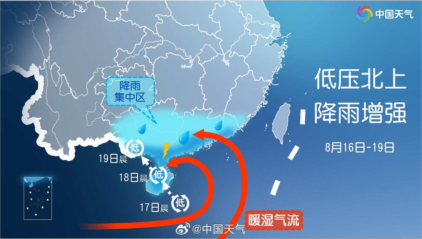 @广东天气 预计,17-19日,受热带低压影响,南部沿海、珠江三角洲市县有大雨到暴雨局部大暴雨,雷雨时局地伴有8级左右短时大风。具体预报: