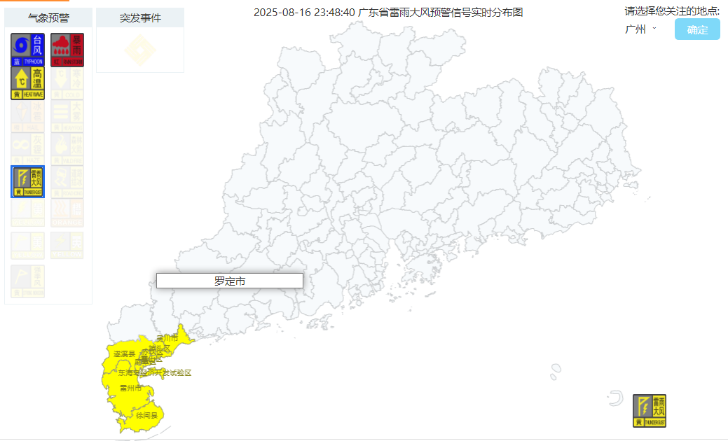 受热带低压影响,16日,广东省防汛防旱防风总指挥部办公室(简称“省三防办”)印发通知,要求各地各部门,做好当前南海热带低压防御工作。截至16日23时48分,广东已有多地发布台风预警以及雷风大雨预警。