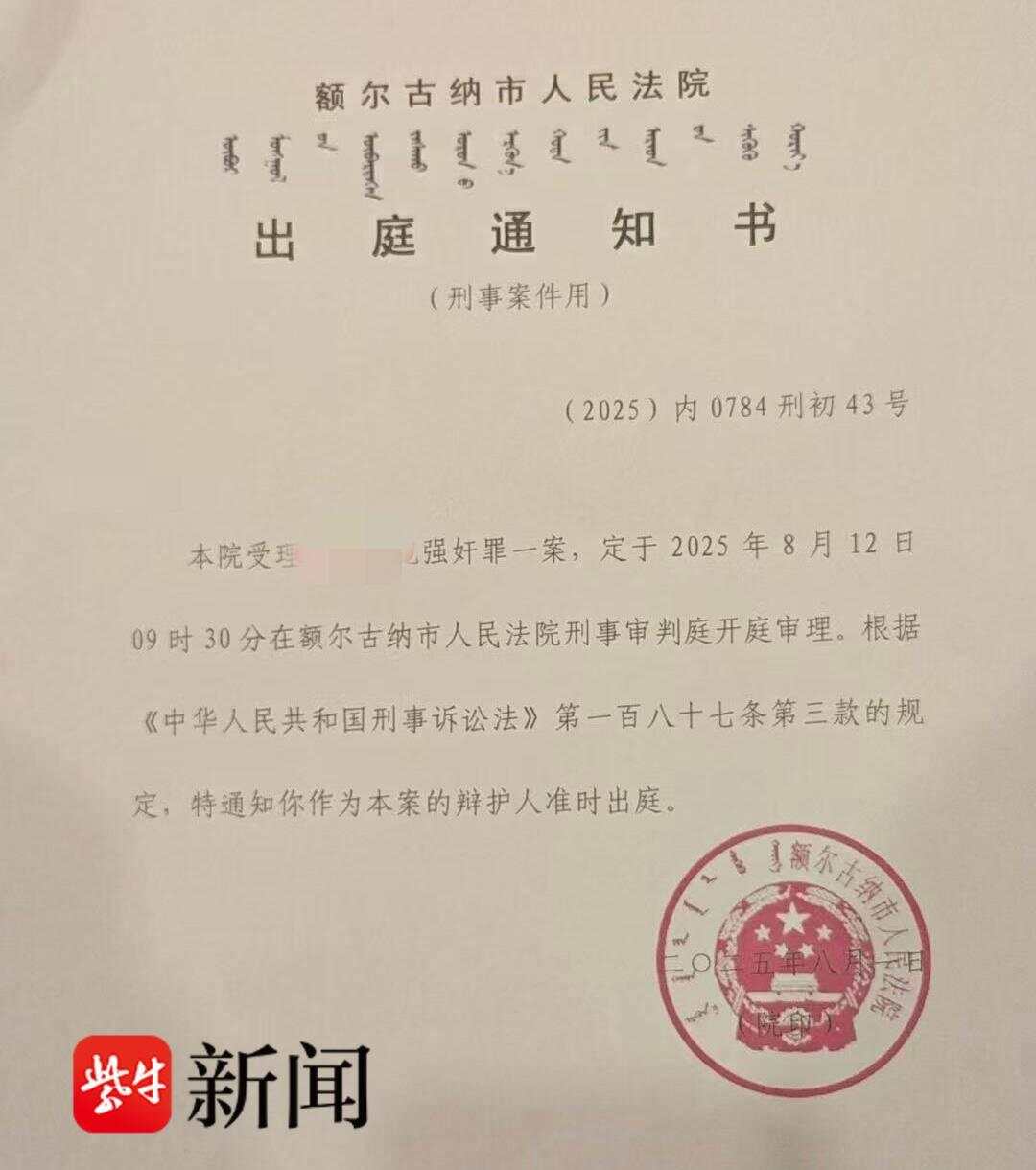 8月9日,此前备受网友关注的内蒙古婚内强奸案迎来最新进展。记者从被告人刘某某姐姐刘女士处获悉,该案一审将于8月12日上午在内蒙古额尔古纳市人民法院开庭审理。记者从刘某某的辩护律师处亦证实了开庭的消息。据出庭通知书显示,刘某某犯强奸罪一案,定于2025年8月12日9时30分在额尔古纳市人民法院刑事审判庭开庭审理。刘女士称,自己也将作为辩护人出庭和辩护律师一起为刘某某作无罪辩护。