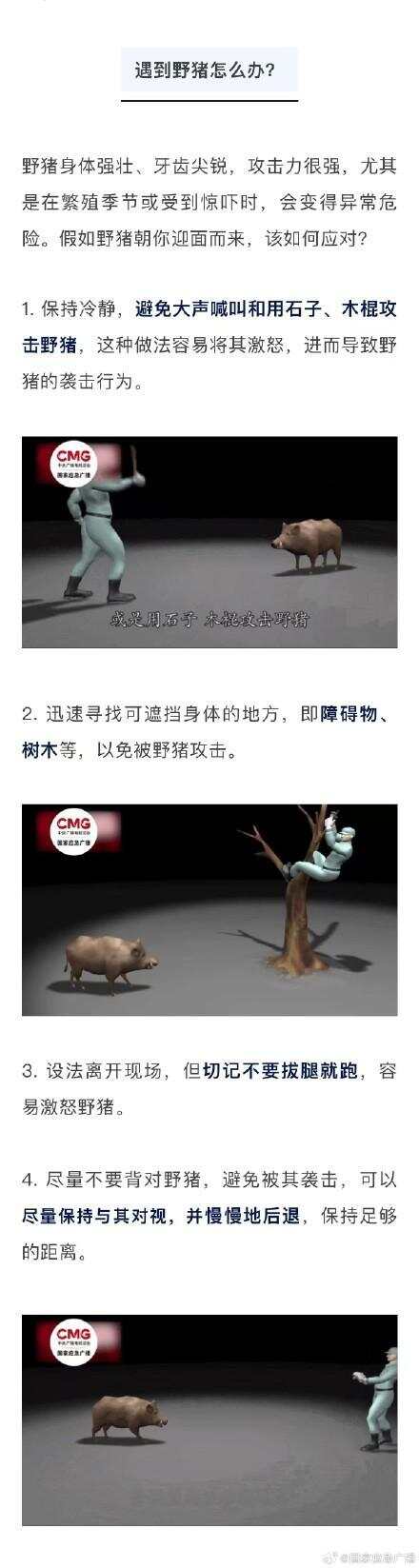 另外“装死”是不管用的。野猪如果感觉受到威胁,对人的攻击性会很强,它对倒在地上的人也会进行攻击的。
