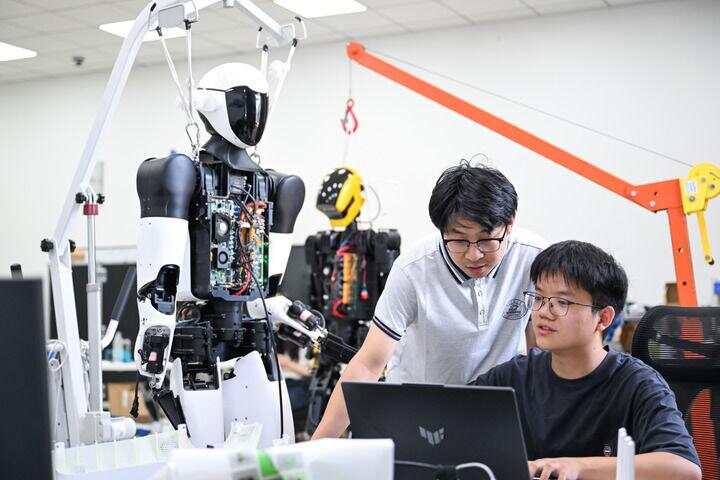 2025年5月29日,在位于湖北省武汉市的华中科技大学机械科学与工程学院,研究人员对“荆楚”人形机器人进行代码调试。新华社记者 杜子璇 摄