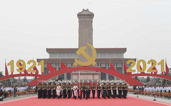 2021年7月1日上午,庆祝中国共产党成立100周年大会在北京天安门广场隆重举行。这是国旗护卫队准备升旗。新华社记者 申宏 摄