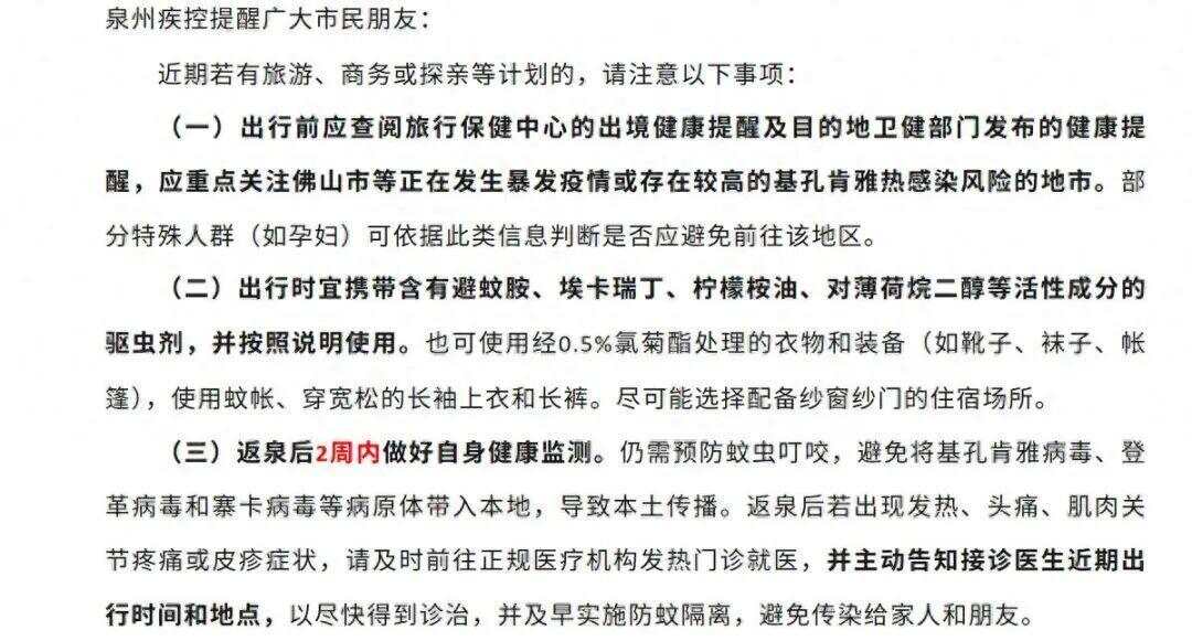 人民日报健康客户端记者发现,福建省福州与泉州两地分别在7月29日与31日发布健康提示,提醒返榕、返泉人员进行14天自我健康监测,其间若出现发热、关节痛、皮疹等疑似症状,请立即就医并告知旅居史。