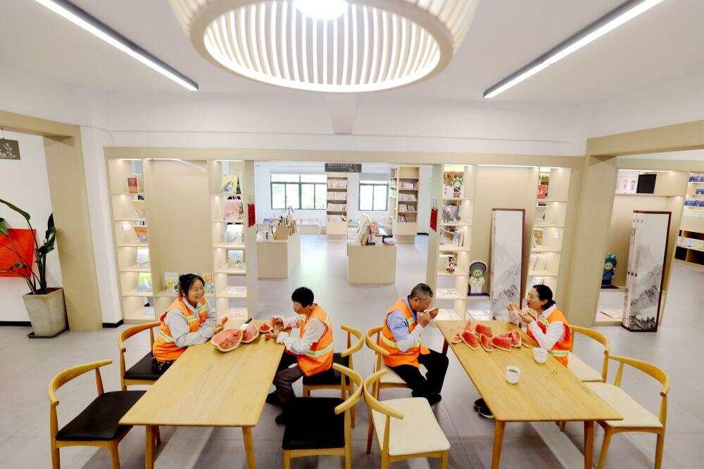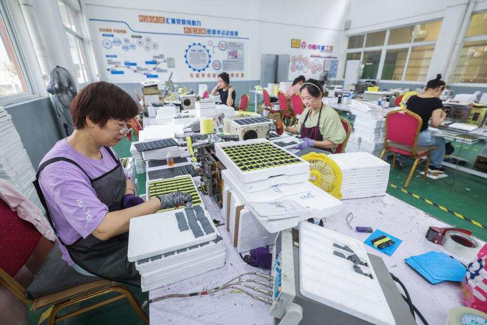 2025年6月19日,村民在浙江省海宁市盐官镇桃园村红“芯”共富工坊内工作。该共富工坊针对有灵活就业需求的低收入村民,采用“灵活就业+固定用工”弹性用工方式,促进群众就业增收。