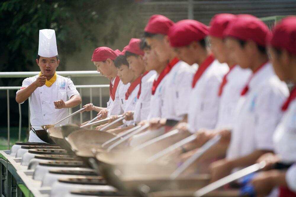 2023年6月25日,在位于西安市蓝田县的蓝田厨师学校,教师指导学生们练习翻勺。蓝田县是著名的“厨师之乡”。通过成立厨师学校,培养具有较高文化素养、艺术素养的一专多能的新一代厨师,蓝田县让具有地方特色的职业教育拓展就业渠道,助力乡村振兴。