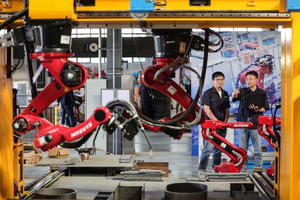 2024年6月3日,沈阳新松机器人自动化股份有限公司的机器人研发工程师讨论智能焊接机器人平台焊接方案。机器人工程技术人员作为人力资源和社会保障部2022年6月公布的18个新职业之一,在研发设计机器人工作中扮演着重要角色。让“铁疙瘩”听懂话、干对活,是他们的重要工作内容。