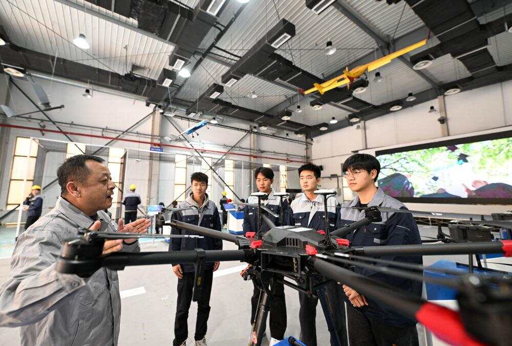 2024年11月12日,天津现代职业技术学院老师在无人机产教融合实践中心指导学生。
