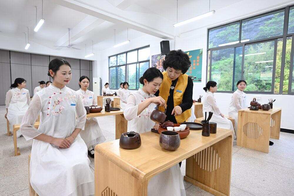 2025年5月8日,福建省武夷山旅游职业中专学校的茶艺老师在教授茶艺。近年来,武夷山市依托当地茶产业优势,持续推进茶文化、茶技能教育走进校园,在当地职业学校重点开设了茶艺、茶叶加工、茶营销等专业,为当地茶产业发展、茶文化传播培养职业技能人才。