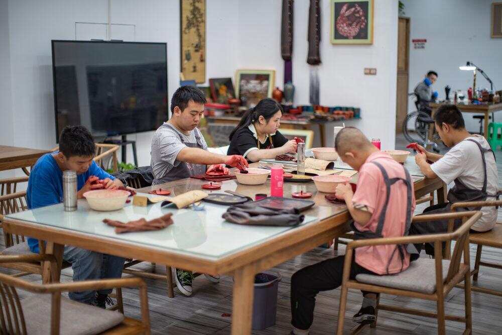 2023年9月18日,在重庆市城口县的“忘我”大漆艺术空间,残障员工打磨漆器产品。“忘我”大漆艺术空间集残疾人漆艺培训、辅助性就业、职业康复、日间照料等功能于一体,利用当地的大木漆资源,组织残疾人创作漆器产品。