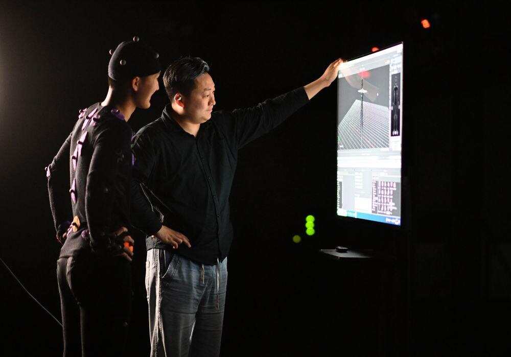 2024年4月23日,在位于天津市滨海新区国家动漫园里的大型动作捕捉棚内,技术顾问崔盛辑(右)和动捕演员马鑫琪查看电脑生成的虚拟角色动作。人社部近年公布的新职业中,数字孪生应用技术员名列其中。崔盛辑正是一名数字孪生应用技术员。他从事数字技术相关工作多年,如今已成立了工作室,主要通过数字孪生技术搭建在影视动画、沉浸式文旅、生命科学等领域的应用场景。