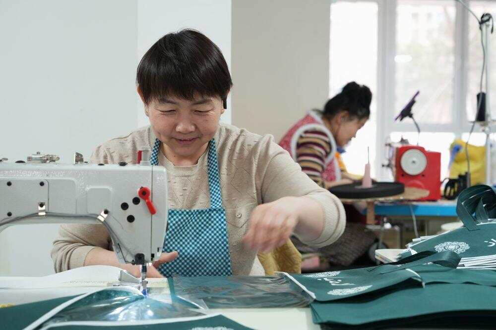 2025年3月27日,回迁居民在雄安新区“雄业创工坊”包装工坊加工无纺布。工坊引入有持续发展潜力、对社区环境影响较小的产业,为回迁群众提供灵活多样的就业岗位,让回迁居民实现“上楼安家,下楼就业”。