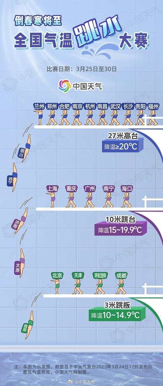 郑州、合肥、南京、杭州、南昌、武汉、长沙、福州等城市在这轮降温过程中最高气温将累计下降20℃以上,例如,南昌26日可能出现35℃高温,之后气温俯冲式下降,29日将暴跌至10℃。