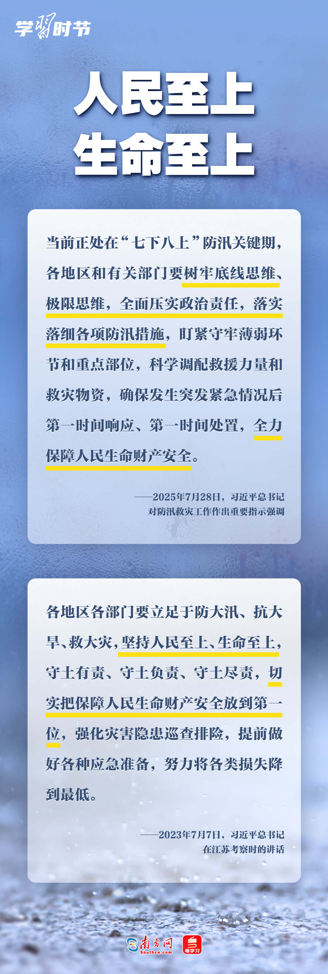 习近平总书记近日对防汛救灾工作作出重要指示,强调要“全面压实政治责任,落实落细各项防汛措施,盯紧守牢薄弱环节和重点部位,科学调配救援力量和救灾物资,确保发生突发紧急情况后第一时间响应、第一时间处置,全力保障人民生命财产安全”。