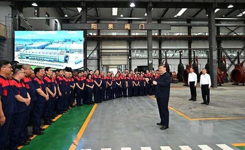 △2025年7月7日,习近平总书记在山西阳泉阀门股份有限公司考察时,同企业员工亲切交流。