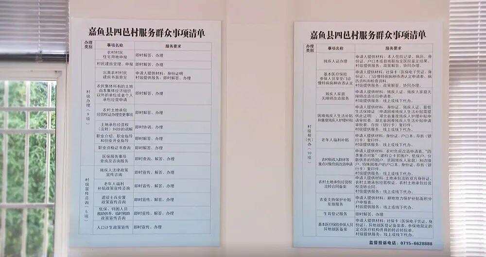 △湖北咸宁市潘家湾镇四邑村党群服务中心张贴的《服务群众事项清单》。
