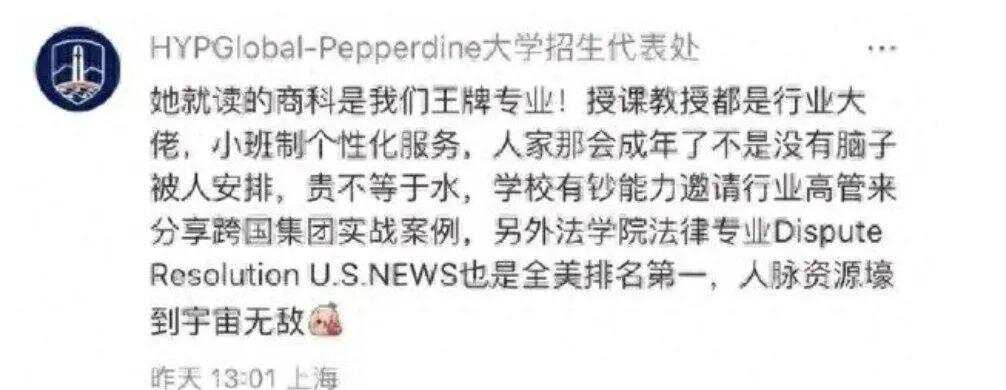 对此,佩珀代因大学急得亲自下场辟谣,据其招生处表示:宗馥莉读的商科是该校的王牌专业,授课教授都是行业大佬,该校的法学更是号称全美第一,人脉资源更是“壕到宇宙无敌”。