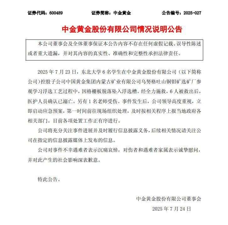 新京报讯 针对东北大学6名学生在子公司参观学习中意外坠落溺亡一事,7月24日,中金黄金发布情况说明公告。公告指出,事发后,公司立即启动应急预案,前往现场组织处理。公司对遇难者表示沉痛哀悼,对伤者和遇难者家属表示诚挚慰问,并对此产生的社会影响深表歉意。以下为全文:
