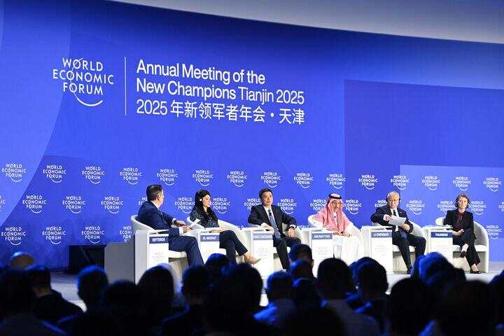 2025年6月24日,在国家会展中心(天津),嘉宾在“能源转型现状如何”分论坛现场交流。6月24日至26日,世界经济论坛第十六届新领军者年会(2025夏季达沃斯论坛)在天津举行。新华社记者 赵子硕 摄