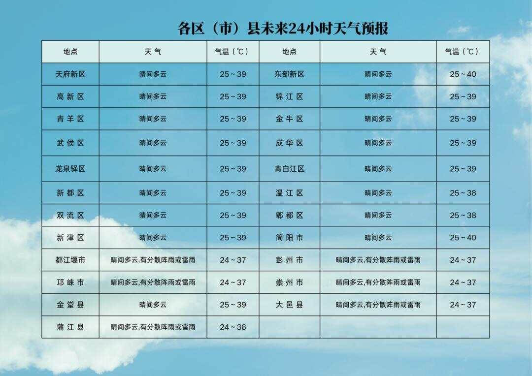 未来三天:17、18日四川省以晴到多云天气为主,盆地大部日最高气温35~39℃,局部可达40℃或以上,其中盆地西部北部、川西高原和攀西地区有分散阵雨或雷雨;