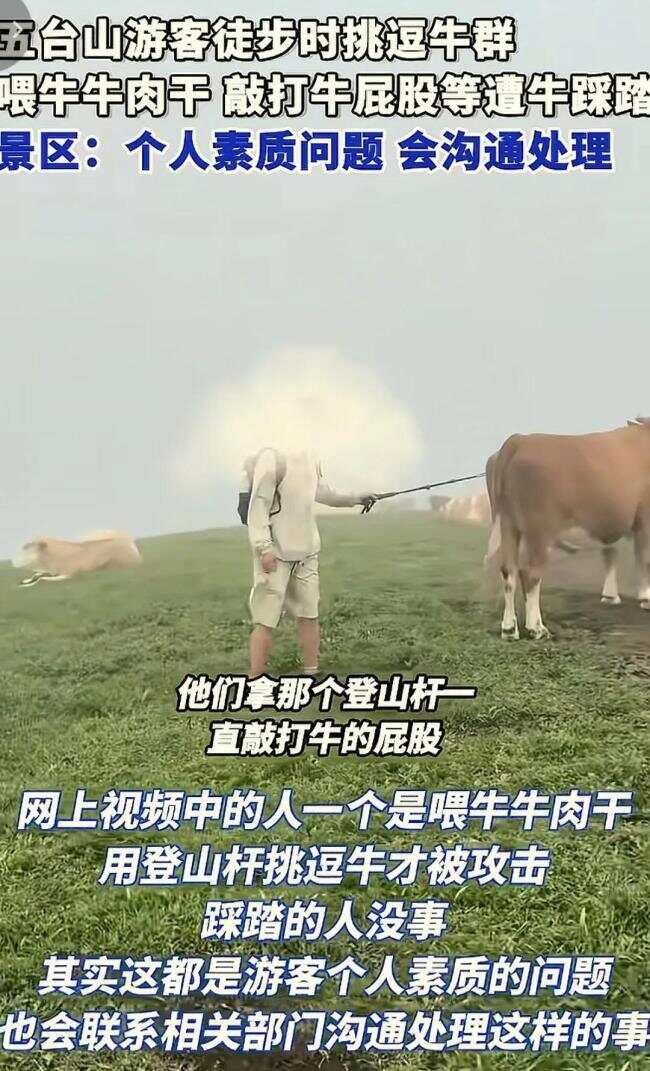 游客喂牛牛肉干挑逗牛群遭踩踏!7月16日,山西忻州五台山风景区发生了一起游客被牛群攻击踩踏的事件。当时,一些游客在徒步朝台时,多次用登山杆敲打牛屁股,甚至有人趁牛休息时坐在牛背上。这些行为最终导致了牛群的攻击。